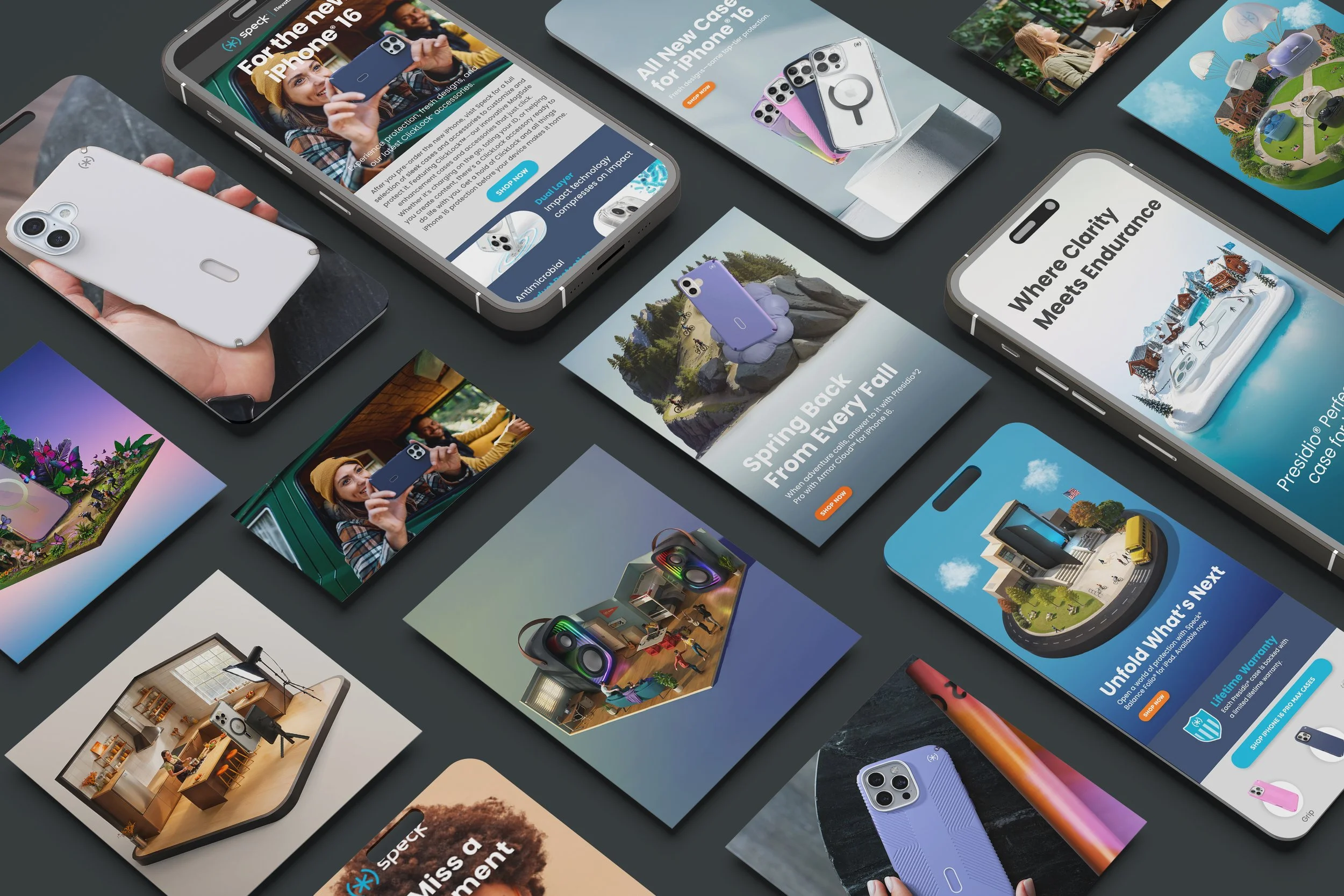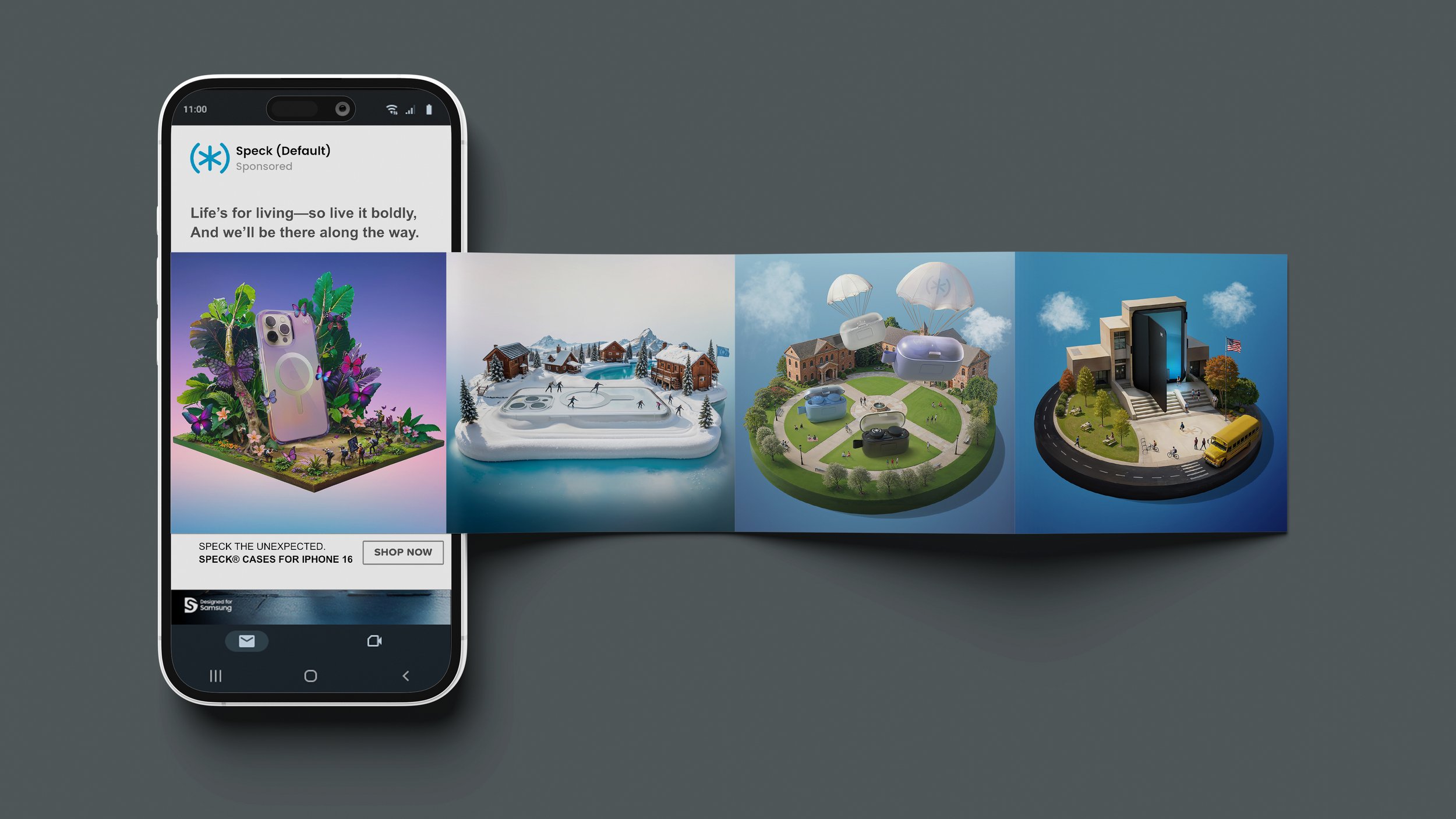 For the iPhone 16 launch, we wanted to shift how people see Speck, beyond “phone protection” to a brand that’s ready for life’s unpredictable moments. Our new platform, “Speck the Unexpected,” positioned Speck as the go-to for staying prepared, no matter what. The campaign came to life through bold, surreal scenarios—like an airborne speaker delivery or an iPad turning into a classroom on the go—showcasing how our designs keep you covered when life throws a curveball. Rolling out across lifestyle photography, short-form video, digital ads, and social-first storytelling, the work celebrated spontaneity and resilience. From concept to launch, I led the creative vision, shaping the campaign’s look, voice, and cross-channel presence to create something unmistakably Speck.