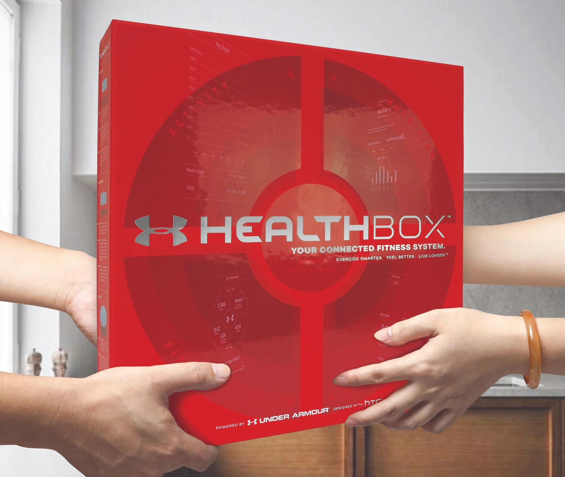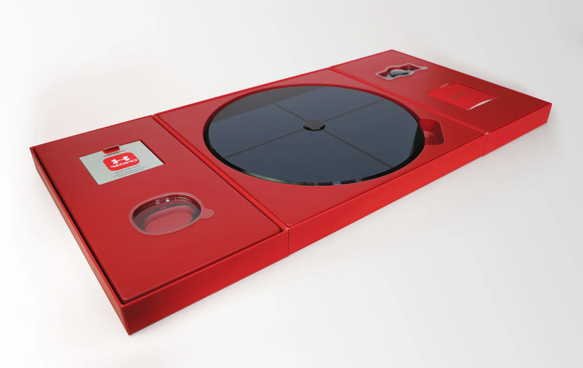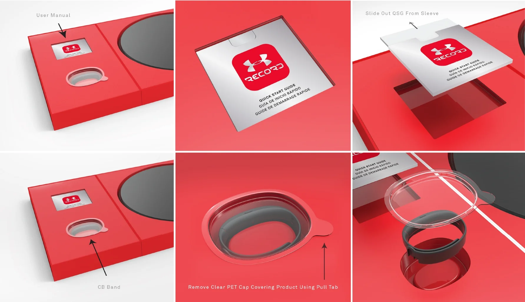 In addition to the Healthbox, we also designed individual boxes to sell the products separately, including the Under Armour Scale packaging. This structure borrowed parts taken from the Healthbox. We eliminated the side doors and modified the dimensions of the base and internal tray. We intentionally designed the Scale package to use the same functional molded polystyrene tray to securely hold the scale in place. The design of three recesses were molded into the bottom of the tray so we could discretely organize and display the Quick Start Guide and manuals under the scale.